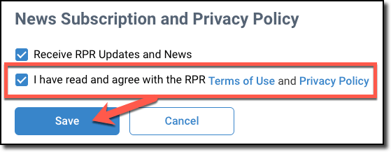 It is required that you put a checkmark in the box before “I have read and agree with the RPR Terms of Use and Privacy Policy.” You can click the blue links to read the Terms of Use or Privacy Policy.