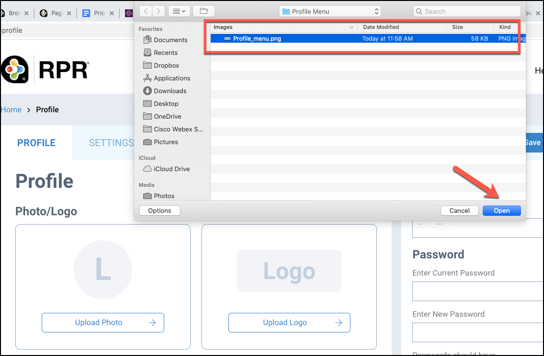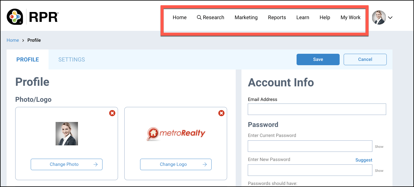 You can upload your agent photo and logo to display on the cover page of your reports. Go to your Profile and click the downward arrow to open it, then select Profile from the menu.