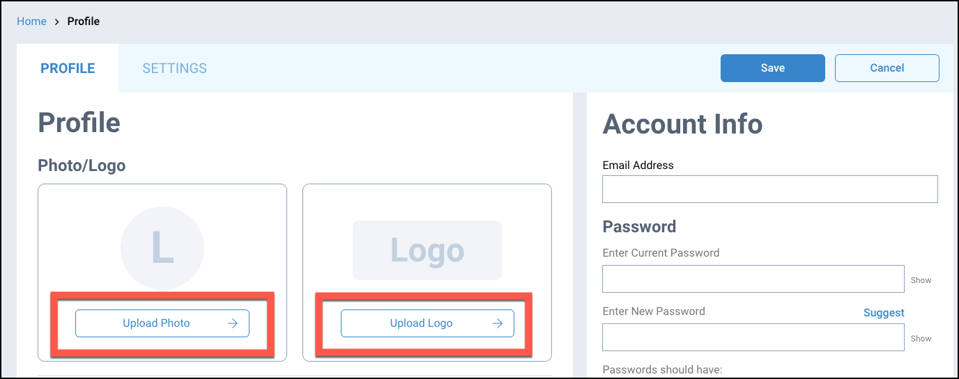 Click the Update photo or Update Logo button (choose and upload one at a time).