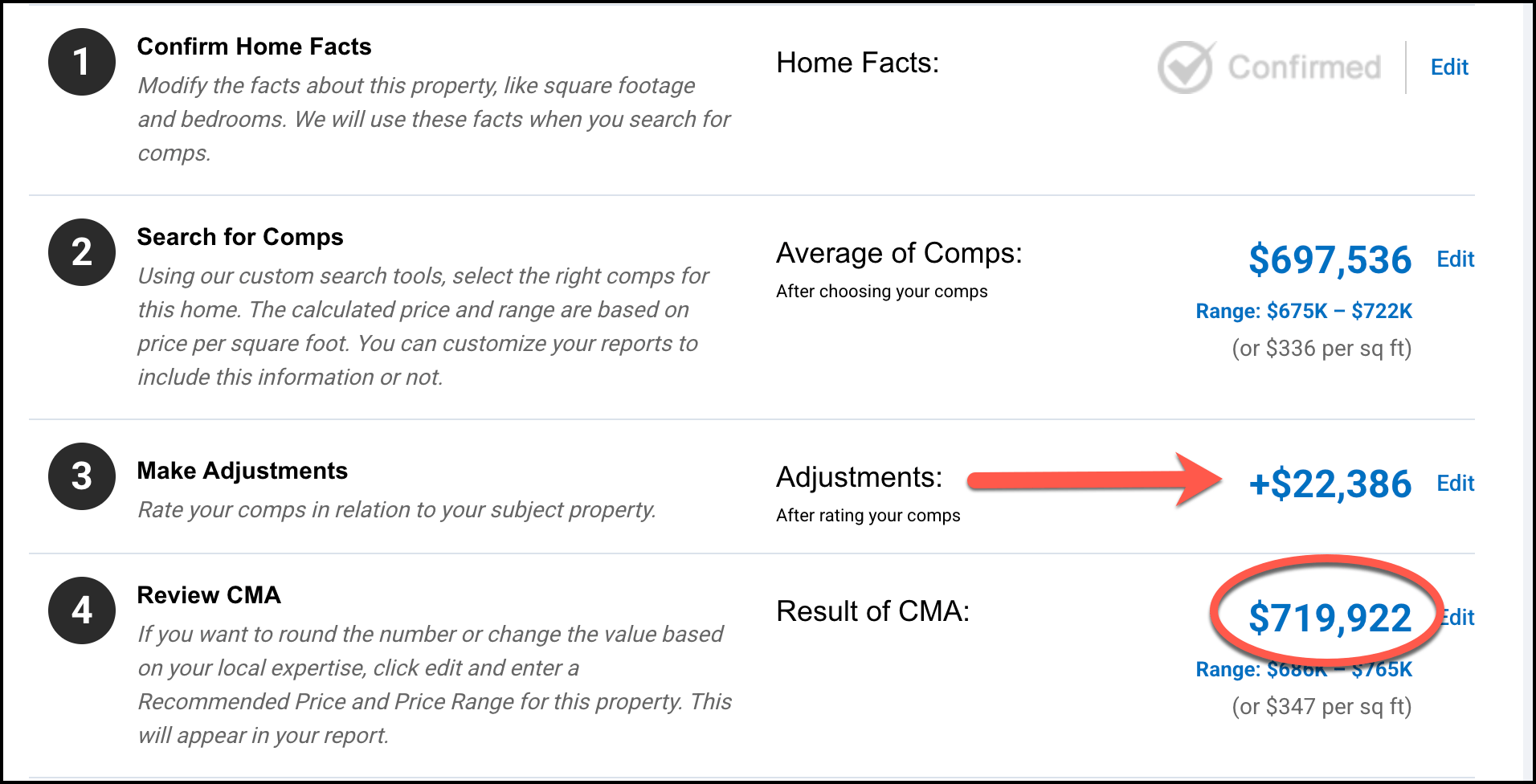 Review the result of your CMA. Click Edit if you want to edit the result or range (e.g. round up or narrow range). Click the Save button when finished.