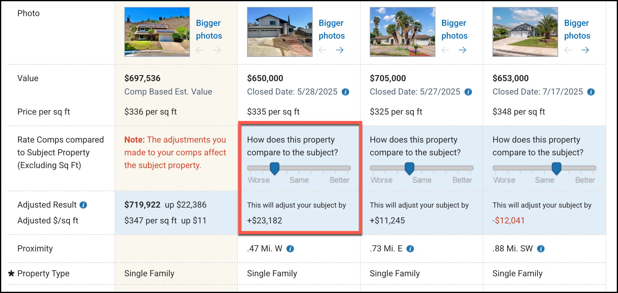 Click the Adjust Comps button to consider how each comp compares to the subject property.