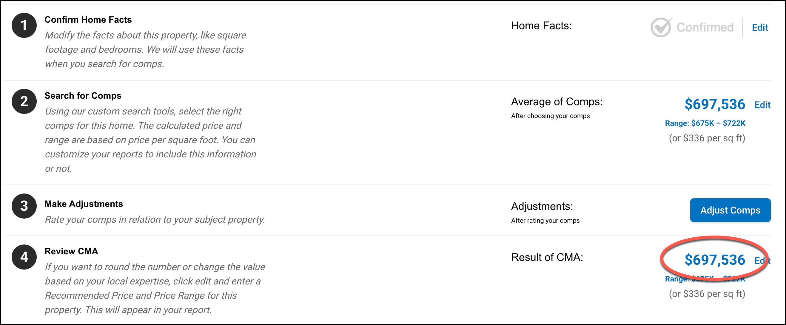 You will land on our 5-Step CMA page where you will review the property facts, find comps, make adjustments, and create a report. Some steps are unclickable until you complete the previous step.