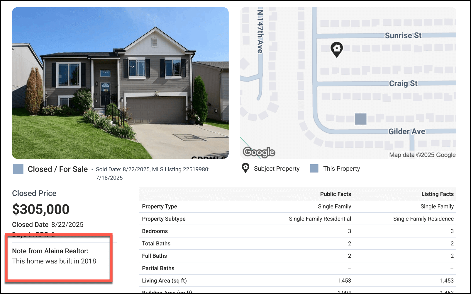 Notes added in Step 3 of a CMA will replace the Listing Description, Range, Confidence Score, Month, and Year Change on the Comp Property Details report pages.