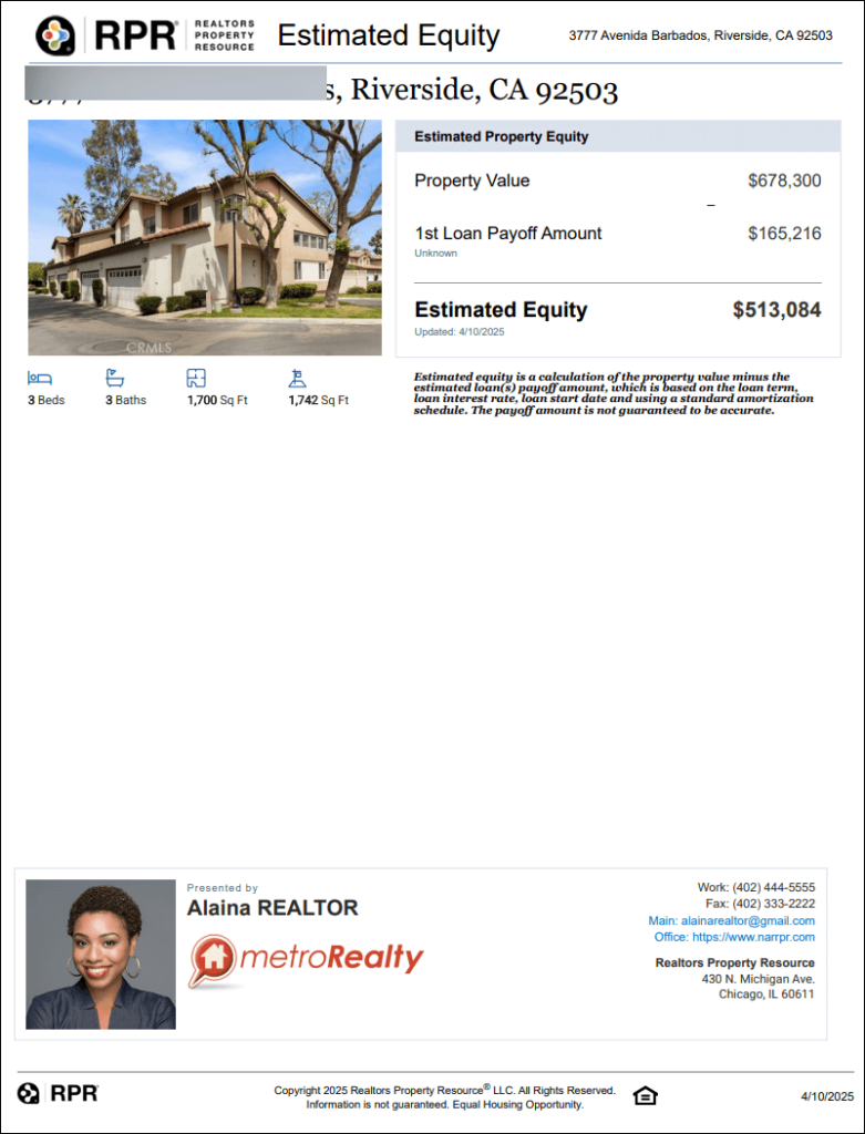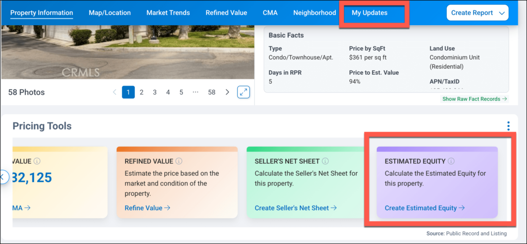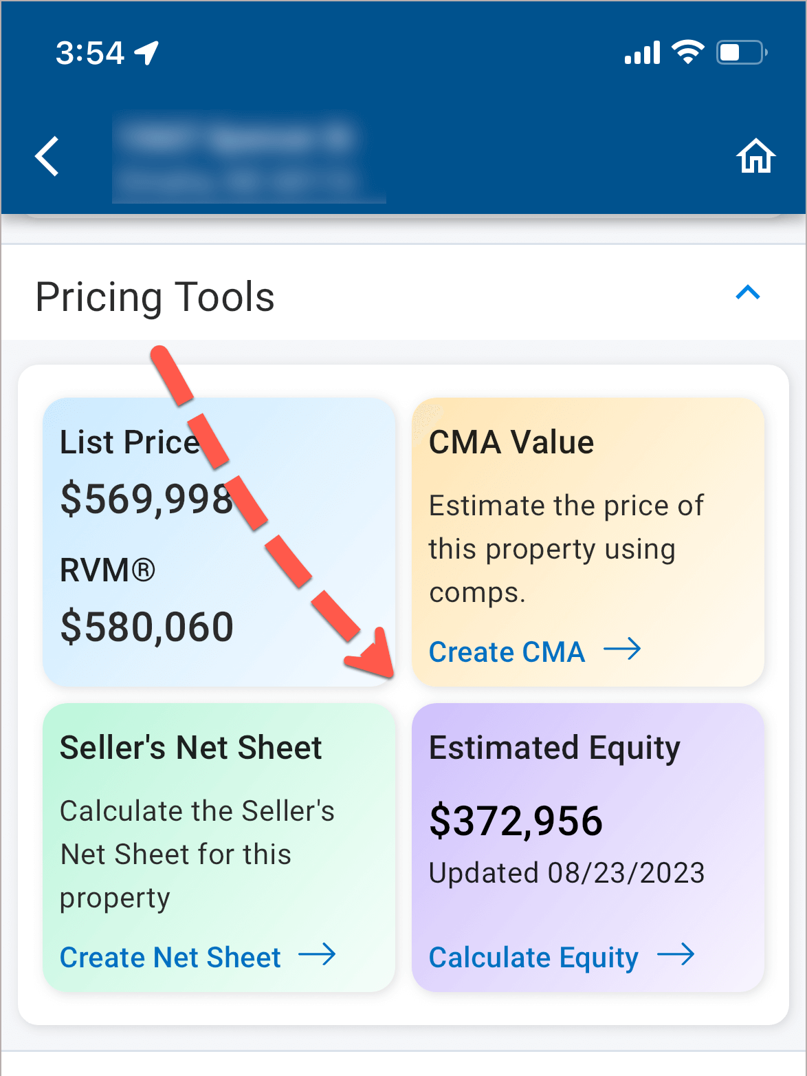 Calculate the equity in your seller’s property and share an Estimated Equity Report from the entry form or include it in a Next Gen Seller or CMA report. Scroll to the Pricing Tools section of any residential property and find the Estimated Equity box.