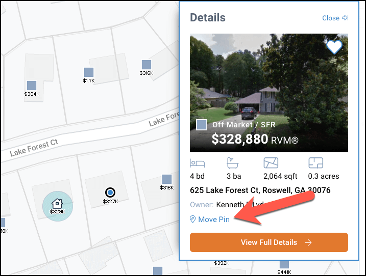 If the map pin is showing within the wrong boundary on the map, you can move it to its proper place. On the Property Summary, click anywhere on the map to open it. Click on the house-shaped icon and when the Details box opens, select Move Pin. Click the icon on the map and drag it to the proper place. Next, click the OK button, then click the X at the top right of the screen to exit. Refresh your page and the map pin and Google street view photo should reflect the new location. The new location and Google Street View photo will appear in any reports that you run.