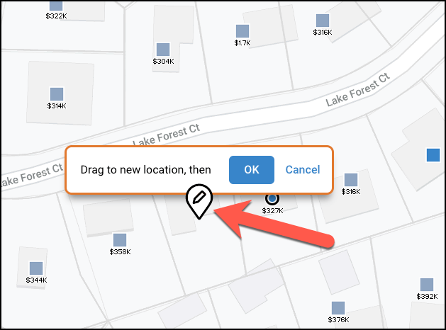 Click on the icon and drag it to the proper location, then click the OK button. The map pin will show on the map as a house again.