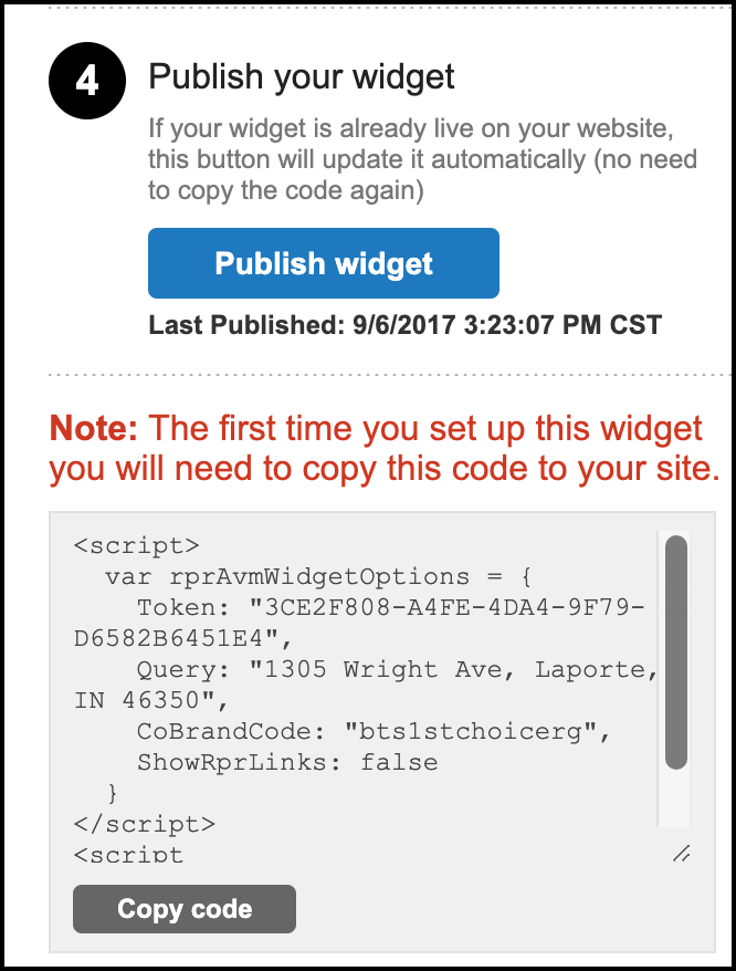 4) Click the Publish widget button. Copy and paste the code to your website.