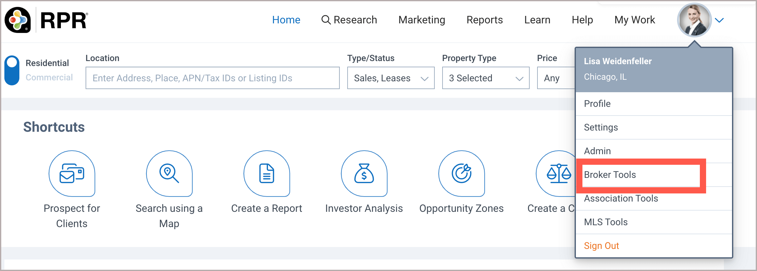 Open your Profile Menu at the top right of your screen and select Broker Tools