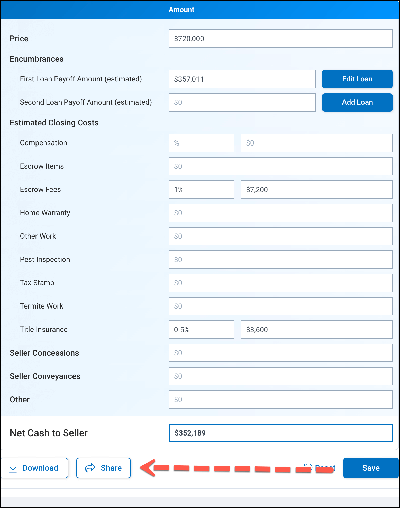 Estimate how much your seller will profit from the sale of their property. With each input, the Net Cash to Seller total will automatically update. You can download or share the Seller’s Net Sheet directly from the entry form or include it when customizing your Seller or CMA report.