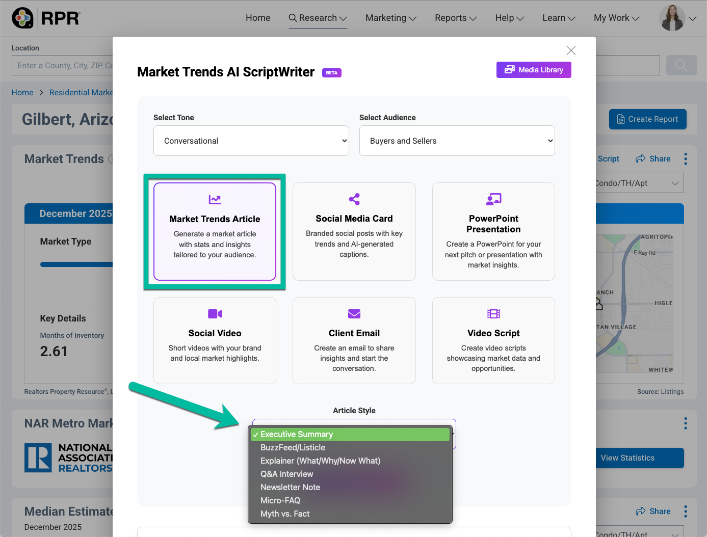 From there, choose your tone and audience, then select Market Trends Article. Scroll down, and you’ll see a variety of new article style options—each designed to help you communicate market data in a way that feels natural, relevant and engaging to different readers.