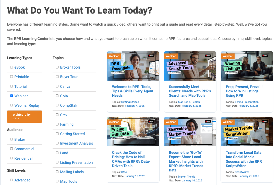 Each webinar is designed to maximize your understanding of RPR’s extensive property data and cutting-edge tools. Whether you’re looking to bolster your marketing strategies, fine-tune your prospecting chops, learn how to create spot-on CMAs or impress clients with customizable property reports, RPR’s webinars have you covered.