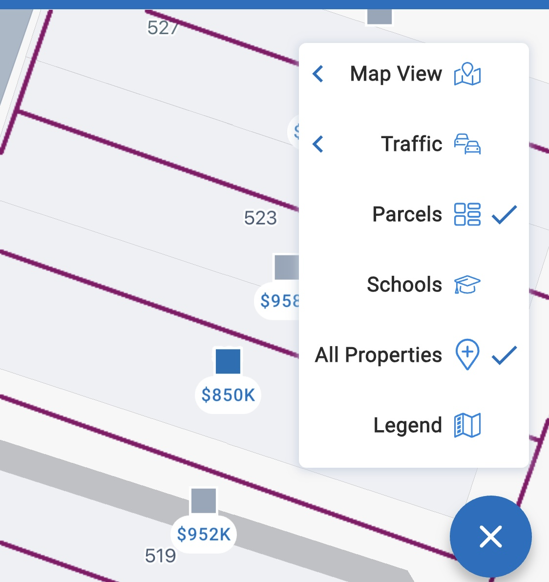 | This is a great way to visually break apart the property lines in the RPR app. From the Home screen, select the more icon and activate “Parcels” to view parcel boundaries. Once activated the purple boundaries will appear based on your Zoom level. You can also select “All Properties” to view both on market list prices, recently sold prices and off market RVMs. |