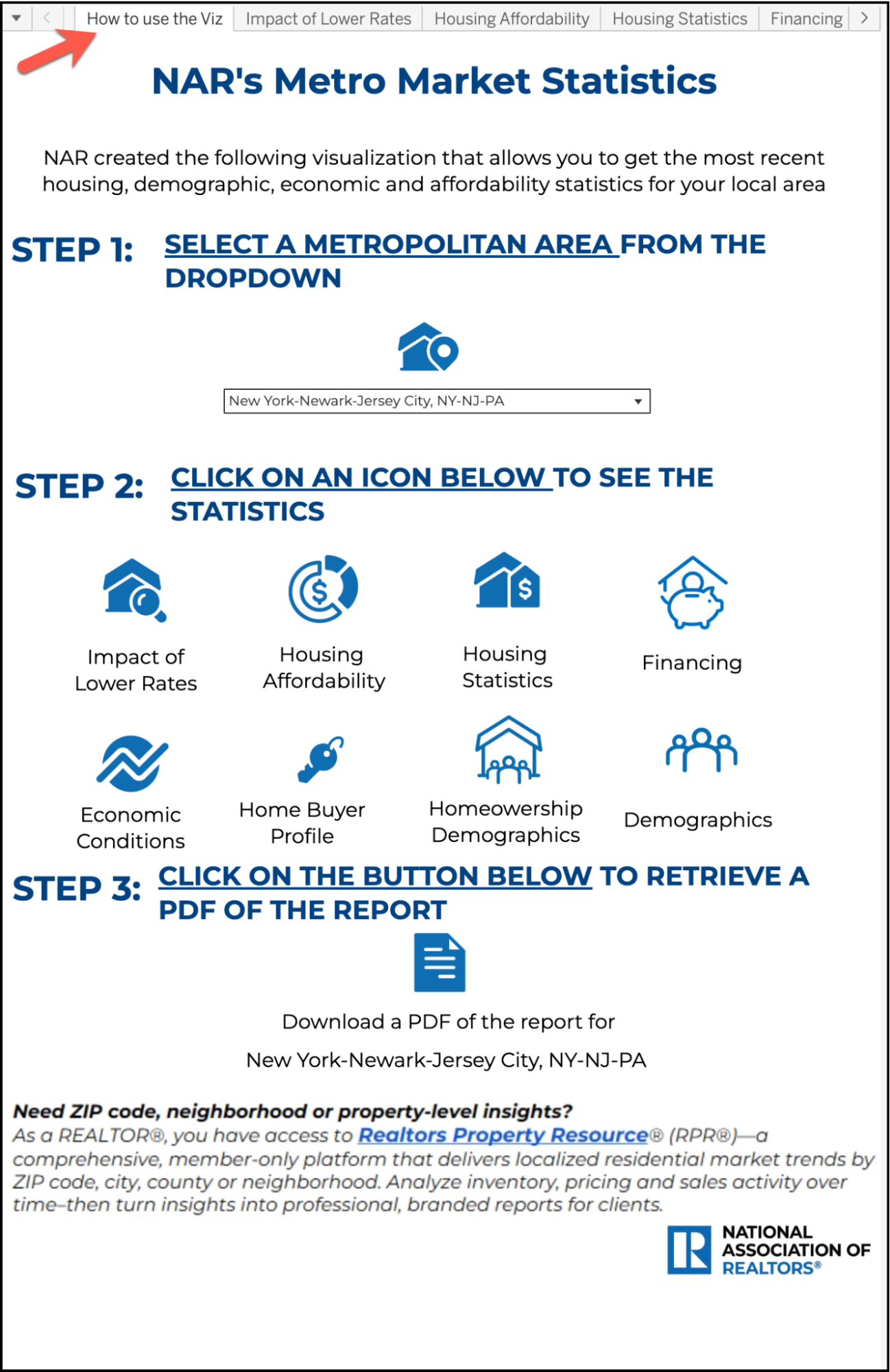 We’ve added a link to the NAR REALTOR.org website that takes RPR users (NAR Members) to a dashboard displaying housing, demographic, economic and affordability statistics.