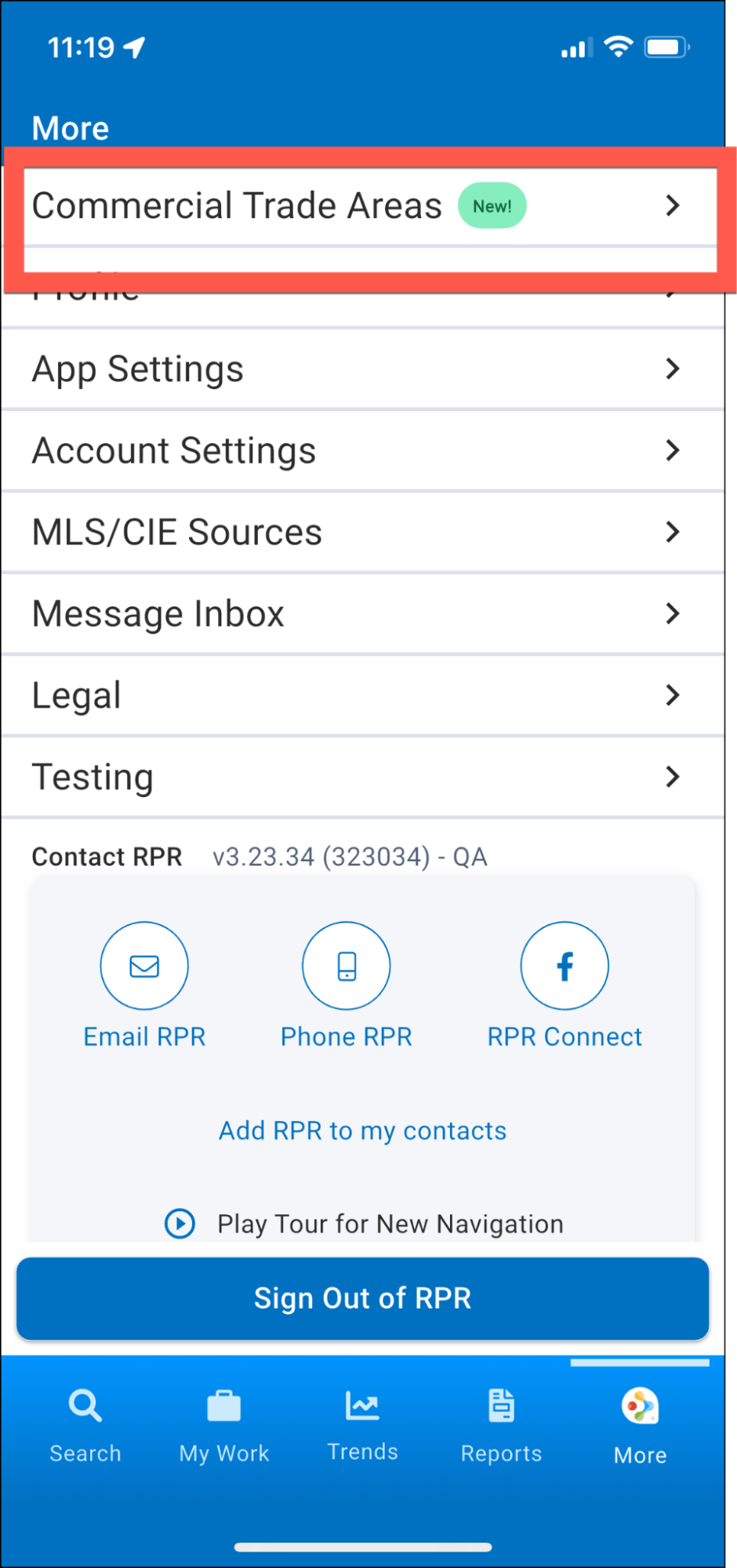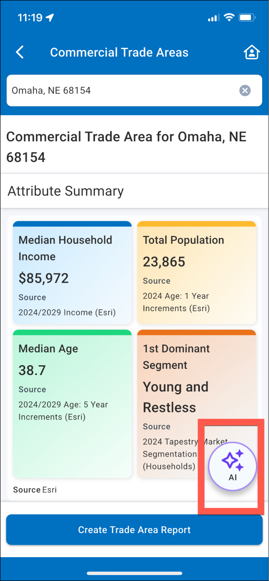 We have added the Commercial Trade Area Search to the Menu tab in the bottom navigation. Users simply have to tap “Menu”, then select Commercial Trade Areas. It will default to their location and a search bar is available that supports searching by counties, cities, ZIPs and neighborhoods.